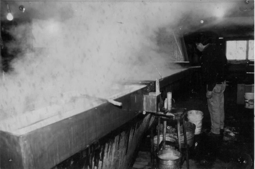 By that point, the operation was showing its age and needed a phased restoration to ensure it could continue producing high quality syrup and a welcome space during the sugaring season. It was decided that the operation should harken to its roots while updating the equipment for 21st-century standards. The old lines were removed and replaced with food-grade buckets; the lead-soldered evaporator pans and sap tanks were replaced with stainless steel counterparts; and the bottling — now exclusively in glass — in glass was processed through new filters and stainless steel canning kettles. Then in 2018 the sugarhouse, which had been sinking into the hillside, was given a new foundation and frame while preserving the original wood siding from the original building. Today, we are proud to carry on in Ernest and Arnold’s legacy in protecting the trees, producing the finest maple syrup possible, and warmly welcoming you to enjoy the sweet steam with us during the season!